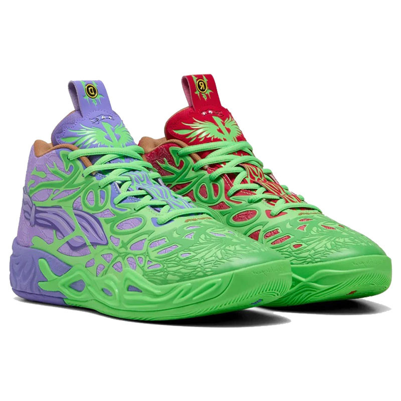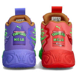 La popolare silhouette MB.04 di Puma viene reimmaginata in stili che riflettono Raffaello e Donatello, due degli amati personaggi delle tartarughe ninja. Ogni scarpa presenta elementi di design e colori caratteristici dei rispettivi eroi del cartoon: